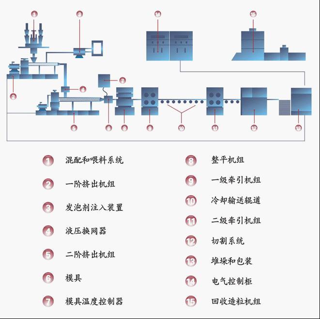 XPS發(fā)泡板材生產(chǎn)線使用的主要原料是全新或回收的聚苯乙烯(PS)顆粒,通常需要加入色母粒或阻燃劑等添加劑,把混配后的原料喂到一階擠出機(jī)組進(jìn)行熔融塑化并攪拌,持續(xù)注入發(fā)泡劑(如氟里昂、丁烷和二氧化碳CO2等)并快速混煉加壓,然后擠出通過(guò)液壓換網(wǎng)器,把流體聚合物中的雜質(zhì)過(guò)濾出來(lái),接著混合物被推送到二階擠出機(jī)組,進(jìn)一步地充分混合并降溫,在此階段對(duì)聚合物的溫度和壓力進(jìn)行控制,而后被擠出有特定流道的模具,此時(shí)混在聚合物中保持高壓的發(fā)泡劑在瞬間壓力釋放,發(fā)泡劑氣化形成很多各自獨(dú)立的微小氣泡,被包裹在聚苯乙烯膜泡內(nèi),經(jīng)冷卻定型形成截面均勻、閉孔蜂窩狀的板材,接著是整平機(jī)組和牽引輸送輥道,然后經(jīng)過(guò)切割系統(tǒng)得到預(yù)定尺寸的XPS擠塑板,后是堆垛和包裝入庫(kù)。邊角廢料通過(guò)回收造粒機(jī)得到循環(huán)利用。一般情況下,XPS板材還要經(jīng)過(guò)開(kāi)槽、表面打毛或銑邊成型等處理以滿足不同的應(yīng)用。